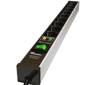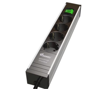 Professional quality! 4 schuko inserts switched, 2 inserts unswitched. Casing: Robust anodized aluminium frame. 2-poled switch. Socket outlets black, 45° positioned with children protection. Shielded power connection cord: 2 meter, 3 x 1.0 mm². Integrated decoupling filter. Display for over voltage protection funktion PRO-TECTOR: Line filter with an attenuation of 50 dBm; HF-filter over 80 MHz. Connection voltage: 250 V / 50 Hz. Current load: 10 A. Size: 572 x 52 x 45 mm